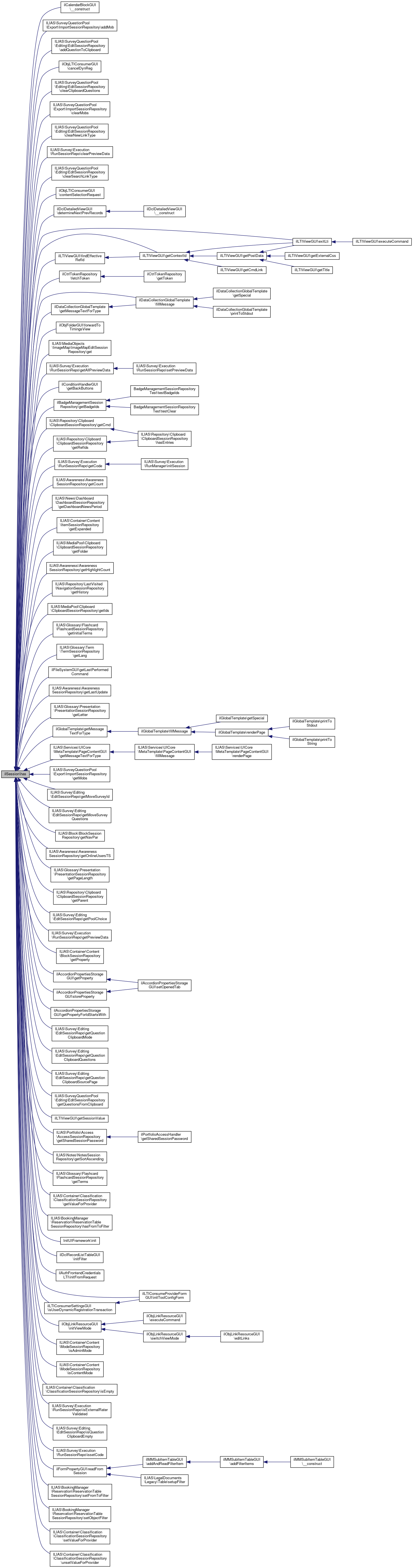 Referenced by ilCalendarBlockGUI\__construct(), ILIAS\SurveyQuestionPool\Export\ImportSessionRepository\addMob(), ILIAS\SurveyQuestionPool\Editing\EditSessionRepository\addQuestionToClipboard(), ilObjLTIConsumerGUI\cancelDynReg(), ILIAS\SurveyQuestionPool\Editing\EditSessionRepository\clearClipboardQuestions(), ILIAS\SurveyQuestionPool\Export\ImportSessionRepository\clearMobs(), ILIAS\SurveyQuestionPool\Editing\EditSessionRepository\clearNewLinkType(), ILIAS\Survey\Execution\RunSessionRepo\clearPreviewData(), ILIAS\SurveyQuestionPool\Editing\EditSessionRepository\clearSearchLinkType(), ilObjLTIConsumerGUI\contentSelectionRequest(), ilDclDetailedViewGUI\determineNextPrevRecords(), ilLTIViewGUI\exitLti(), ilCtrlTokenRepository\fetchToken(), ilDataCollectionGlobalTemplate\fillMessage(), ilLTIViewGUI\findEffectiveRefId(), ilObjFolderGUI\forwardToTimingsView(), ILIAS\MediaObjects\ImageMap\ImageMapEditSessionRepository\get(), ILIAS\Survey\Execution\RunSessionRepo\getAllPreviewData(), ilConditionHandlerGUI\getBackButtons(), ilBadgeManagementSessionRepository\getBadgeIds(), ILIAS\Repository\Clipboard\ClipboardSessionRepository\getCmd(), ILIAS\Survey\Execution\RunSessionRepo\getCode(), ilLTIViewGUI\getContextId(), ILIAS\Awareness\AwarenessSessionRepository\getCount(), ILIAS\News\Dashboard\DashboardSessionRepository\getDashboardNewsPeriod(), ILIAS\Container\Content\ItemSessionRepository\getExpanded(), ILIAS\MediaPool\Clipboard\ClipboardSessionRepository\getFolder(), ILIAS\Awareness\AwarenessSessionRepository\getHighlightCount(), ILIAS\Repository\LastVisited\NavigationSessionRepository\getHistory(), ILIAS\MediaPool\Clipboard\ClipboardSessionRepository\getIds(), ILIAS\Glossary\Flashcard\FlashcardSessionRepository\getInitialTerms(), ILIAS\Glossary\Term\TermSessionRepository\getLang(), ilFileSystemGUI\getLastPerformedCommand(), ILIAS\Awareness\AwarenessSessionRepository\getLastUpdate(), ILIAS\Glossary\Presentation\PresentationSessionRepository\getLetter(), ilDataCollectionGlobalTemplate\getMessageTextForType(), ilGlobalTemplate\getMessageTextForType(), ILIAS\Services\UICore\MetaTemplate\PageContentGUI\getMessageTextForType(), ILIAS\SurveyQuestionPool\Export\ImportSessionRepository\getMobs(), ILIAS\Survey\Editing\EditSessionRepo\getMoveSurveyId(), ILIAS\Survey\Editing\EditSessionRepo\getMoveSurveyQuestions(), ILIAS\Block\BlockSessionRepository\getNavPar(), ILIAS\Awareness\AwarenessSessionRepository\getOnlineUsersTS(), ILIAS\Glossary\Presentation\PresentationSessionRepository\getPageLength(), ILIAS\Repository\Clipboard\ClipboardSessionRepository\getParent(), ILIAS\Survey\Editing\EditSessionRepo\getPoolChoice(), ILIAS\Survey\Execution\RunSessionRepo\getPreviewData(), ILIAS\Container\Content\BlockSessionRepository\getProperty(), ilAccordionPropertiesStorageGUI\getProperty(), ilAccordionPropertiesStorageGUI\getPropertyForIdStartsWith(), ILIAS\Survey\Editing\EditSessionRepo\getQuestionClipboardMode(), ILIAS\Survey\Editing\EditSessionRepo\getQuestionClipboardQuestions(), ILIAS\Survey\Editing\EditSessionRepo\getQuestionClipboardSourcePage(), ILIAS\SurveyQuestionPool\Editing\EditSessionRepository\getQuestionsFromClipboard(), ILIAS\Repository\Clipboard\ClipboardSessionRepository\getRefIds(), ilLTIViewGUI\getSessionValue(), ILIAS\Portfolio\Access\AccessSessionRepository\getSharedSessionPassword(), ILIAS\Notes\NotesSessionRepository\getSortAscending(), ILIAS\Glossary\Flashcard\FlashcardSessionRepository\getTerms(), ILIAS\Container\Classification\ClassificationSessionRepository\getValueForProvider(), ILIAS\BookingManager\Reservation\ReservationTableSessionRepository\hasFromToFilter(), InitUIFramework\init(), ilDclRecordListTableGUI\initFilter(), ilAuthFrontendCredentialsLTI\initFromRequest(), ilLTIConsumeProviderFormGUI\initToolConfigForm(), ilObjLinkResourceGUI\initViewMode(), ILIAS\Container\Content\ModeSessionRepository\isAdminMode(), ILIAS\Container\Content\ModeSessionRepository\isContentMode(), ILIAS\Container\Classification\ClassificationSessionRepository\isEmpty(), ILIAS\Survey\Execution\RunSessionRepo\isExternalRaterValidated(), ILIAS\Survey\Editing\EditSessionRepo\isQuestionClipboardEmpty(), ILIAS\Survey\Execution\RunSessionRepo\issetCode(), ilLTIConsumerSettingsGUI\isUserDynamicRegistrationTransaction(), ilFormPropertyGUI\readFromSession(), ILIAS\BookingManager\Reservation\ReservationTableSessionRepository\setFromToFilter(), ILIAS\BookingManager\Reservation\ReservationTableSessionRepository\setObjectFilter(), ILIAS\Container\Classification\ClassificationSessionRepository\setValueForProvider(), ilAccordionPropertiesStorageGUI\storeProperty(), and ILIAS\Container\Classification\ClassificationSessionRepository\unsetValueForProvider().