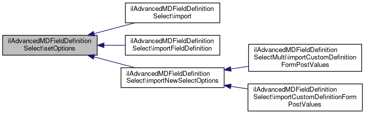 Here is the caller graph for this function:| ilAdvancedMDFieldDefinitionSelect::setOptions | ( | array | $a_values = null | ) |