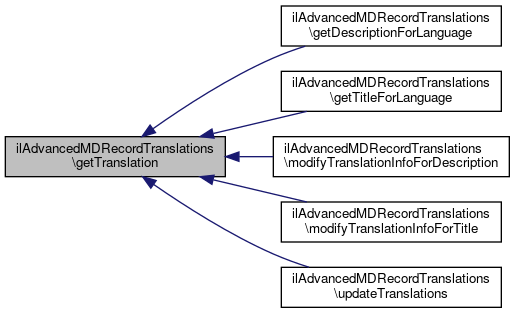 Here is the call graph for this function:| ilAdvancedMDRecordTranslations::getTranslation | ( | string | $lang_key | ) |