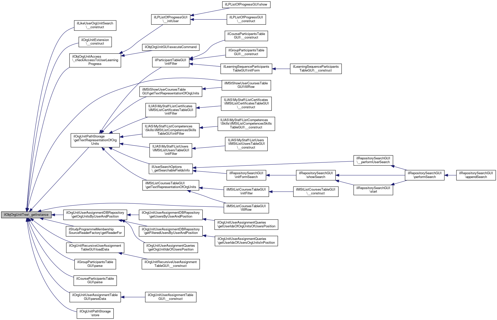 Referenced by ilLikeUserOrgUnitSearch\__construct(), ilOrgUnitExtension\__construct(), ilObjOrgUnitAccess\_checkAccessToUserLearningProgress(), ilMStShowUserCoursesTableGUI\fillRow(), ilMStListCoursesTableGUI\fillRow(), ilOrgUnitUserAssignmentDBRepository\getOrgUnitsByUserAndPosition(), ilStudyProgrammeMembershipSourceReaderFactory\getReaderFor(), ilOrgUnitPathStorage\getTextRepresentationOfOrgUnits(), ilOrgUnitRecursiveUserAssignmentTableGUI\loadData(), ilGroupParticipantsTableGUI\parse(), ilCourseParticipantsTableGUI\parse(), ilOrgUnitUserAssignmentTableGUI\parseData(), and ilOrgUnitPathStorage\store().