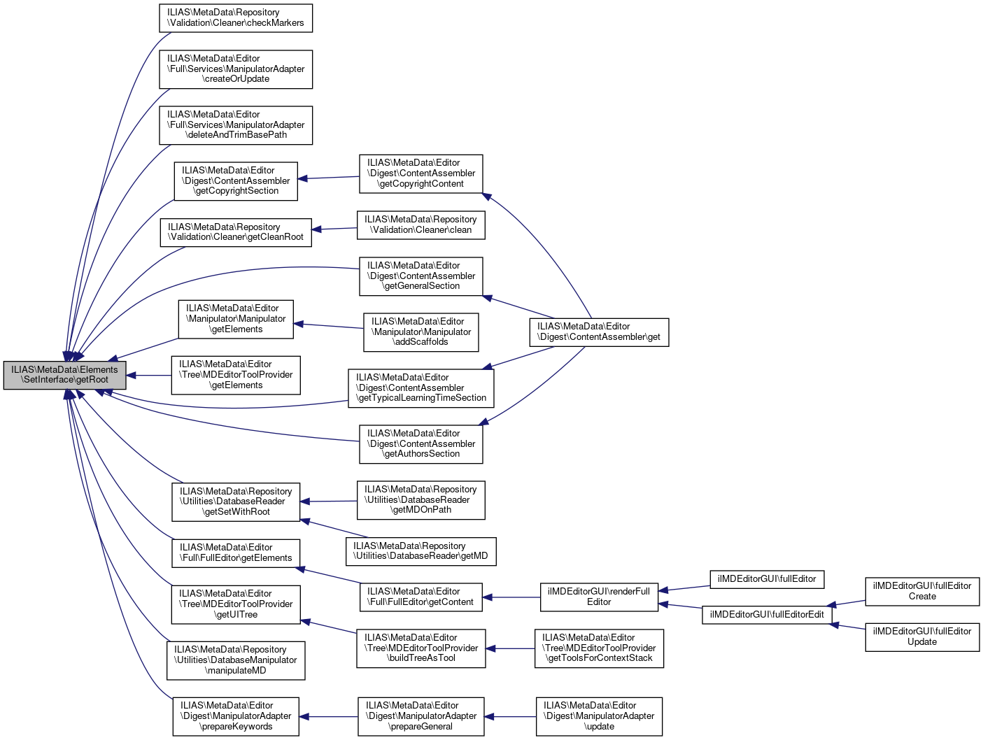 Referenced by ILIAS\MetaData\Repository\Validation\Cleaner\checkMarkers(), ILIAS\MetaData\Editor\Full\Services\ManipulatorAdapter\createOrUpdate(), ILIAS\MetaData\Editor\Full\Services\ManipulatorAdapter\deleteAndTrimBasePath(), ILIAS\MetaData\Editor\Digest\ContentAssembler\getAuthorsSection(), ILIAS\MetaData\Repository\Validation\Cleaner\getCleanRoot(), ILIAS\MetaData\Editor\Digest\ContentAssembler\getCopyrightSection(), ILIAS\MetaData\Editor\Manipulator\Manipulator\getElements(), ILIAS\MetaData\Editor\Tree\MDEditorToolProvider\getElements(), ILIAS\MetaData\Editor\Full\FullEditor\getElements(), ILIAS\MetaData\Editor\Digest\ContentAssembler\getGeneralSection(), ILIAS\MetaData\Repository\Utilities\DatabaseReader\getSetWithRoot(), ILIAS\MetaData\Editor\Digest\ContentAssembler\getTypicalLearningTimeSection(), ILIAS\MetaData\Editor\Tree\MDEditorToolProvider\getUITree(), ILIAS\MetaData\Repository\Utilities\DatabaseManipulator\manipulateMD(), and ILIAS\MetaData\Editor\Digest\ManipulatorAdapter\prepareKeywords().