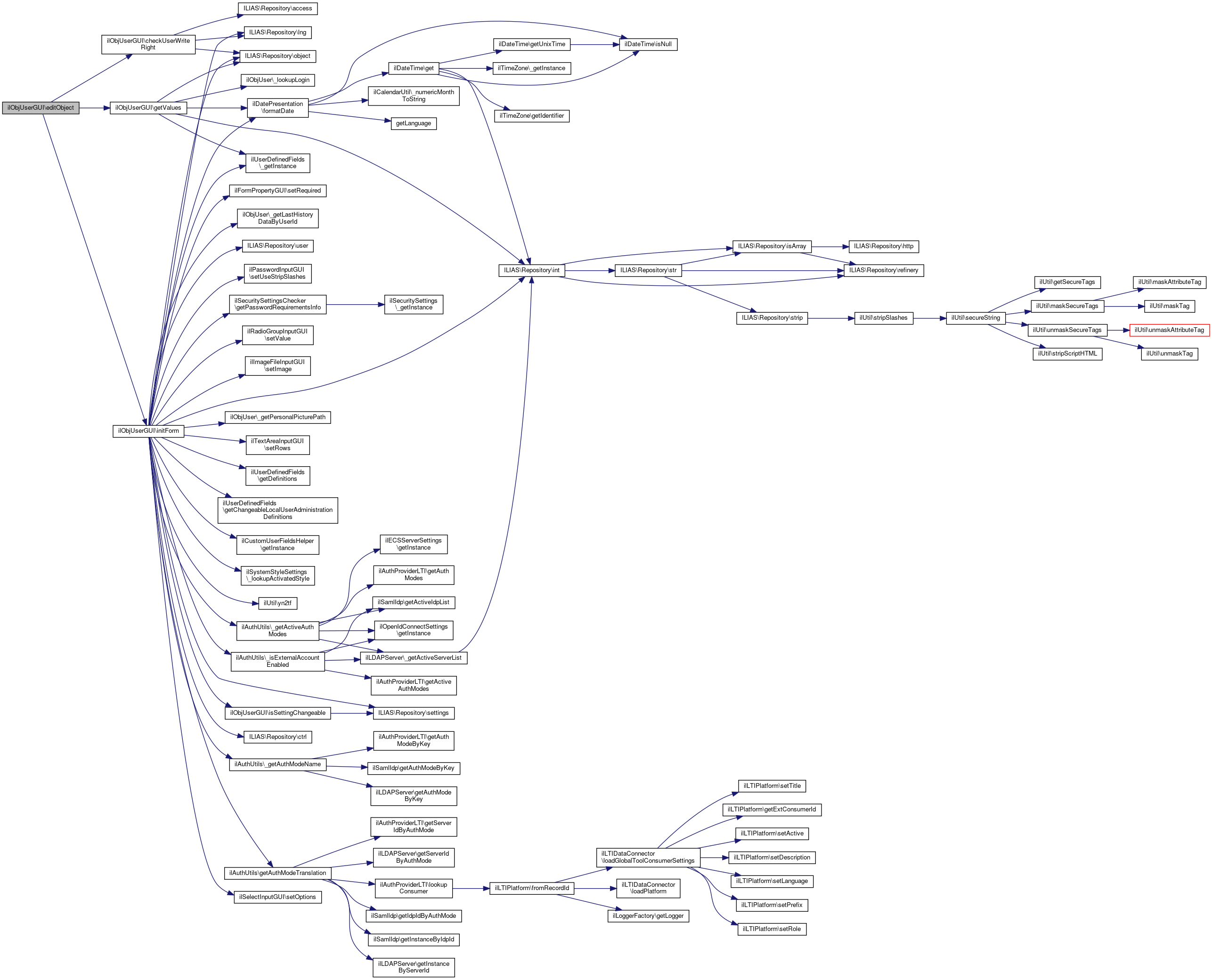 Here is the call graph for this function:| ilObjUserGUI::editObject | ( | ) |