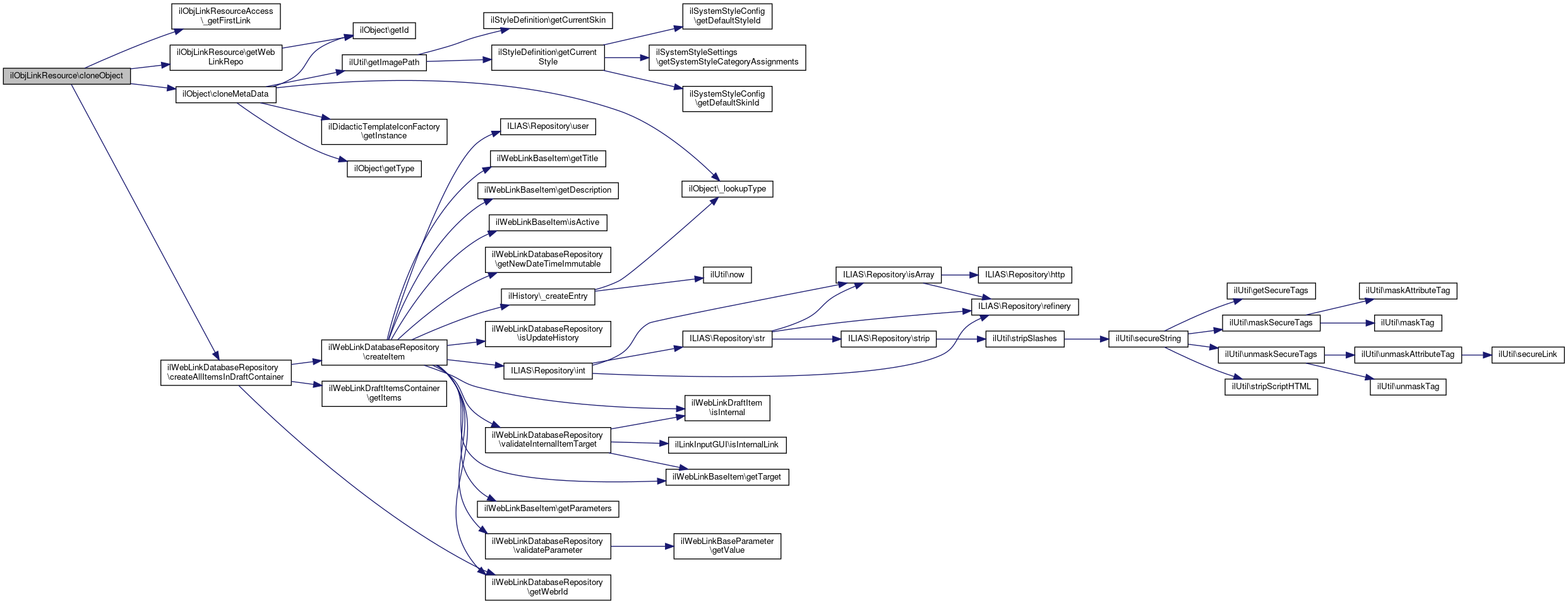 Here is the call graph for this function:| ilObjLinkResource::cloneObject | ( | int | $target_id, |