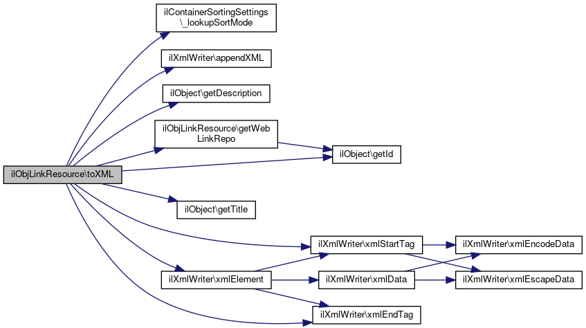 Here is the caller graph for this function:| ilObjLinkResource::toXML | ( | ilXmlWriter | $writer | ) |
