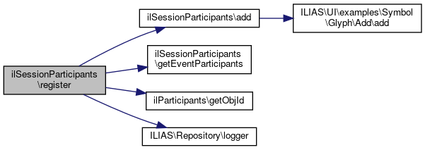 Here is the call graph for this function:| ilSessionParticipants::register | ( | int | $a_usr_id | ) |