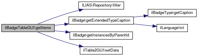 Here is the call graph for this function:| ilBadgeTableGUI::getItems | ( | int | $a_parent_obj_id | ) |