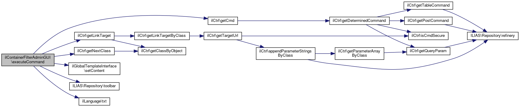 Here is the call graph for this function:| ilContainerFilterAdminGUI::executeCommand | ( | ) |