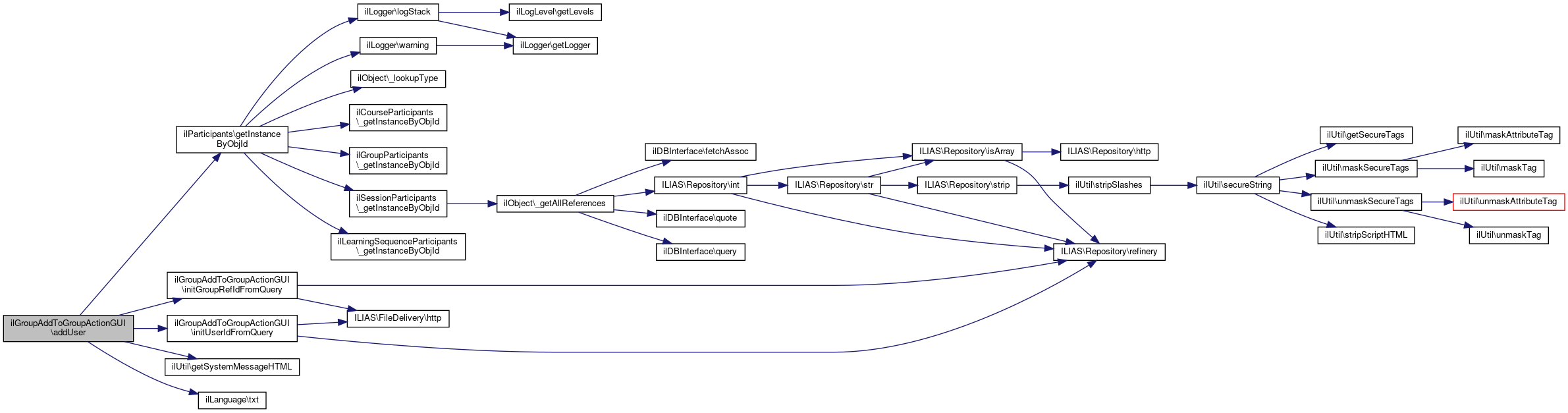Here is the call graph for this function:| ilGroupAddToGroupActionGUI::addUser | ( | ) |