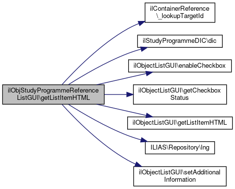 References ilContainerReference\_lookupTargetId(), ilStudyProgrammeDIC\dic(), ilObjectListGUI\enableCheckbox(), ilObjectListGUI\getCheckboxStatus(), ilObjectListGUI\getListItemHTML(), ILIAS\Repository\lng(), and ilObjectListGUI\setAdditionalInformation().
