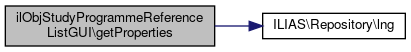 Here is the call graph for this function:| ilObjStudyProgrammeReferenceListGUI::getProperties | ( | ) |