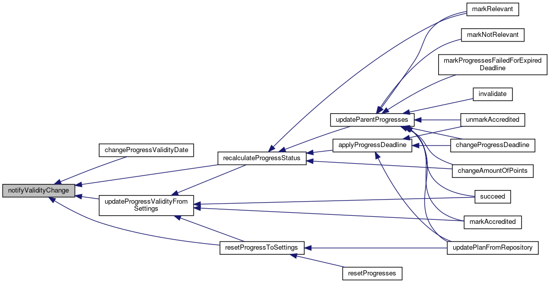 Referenced by applyProgressDeadline(), changeAmountOfPoints(), changeProgressDeadline(), changeProgressValidityDate(), invalidate(), markAccredited(), markNotRelevant(), markProgressesFailedForExpiredDeadline(), markRelevant(), recalculateProgressStatus(), resetProgressToSettings(), succeed(), unmarkAccredited(), updateParentProgresses(), and updateProgressValidityFromSettings().