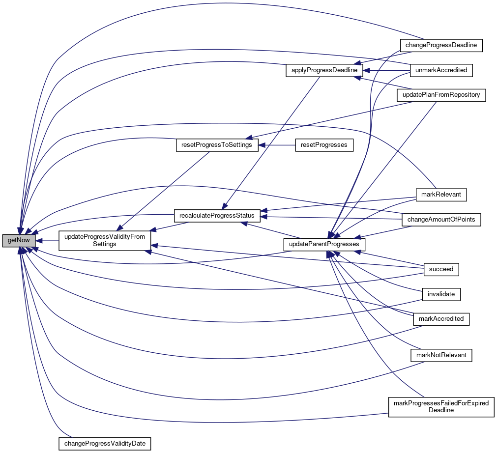 Referenced by changeAmountOfPoints(), changeProgressDeadline(), changeProgressValidityDate(), initAssignmentDates(), invalidate(), markAccredited(), markNotRelevant(), markProgressesFailedForExpiredDeadline(), markRelevant(), resetProgresses(), succeed(), unmarkAccredited(), and updatePlanFromRepository().