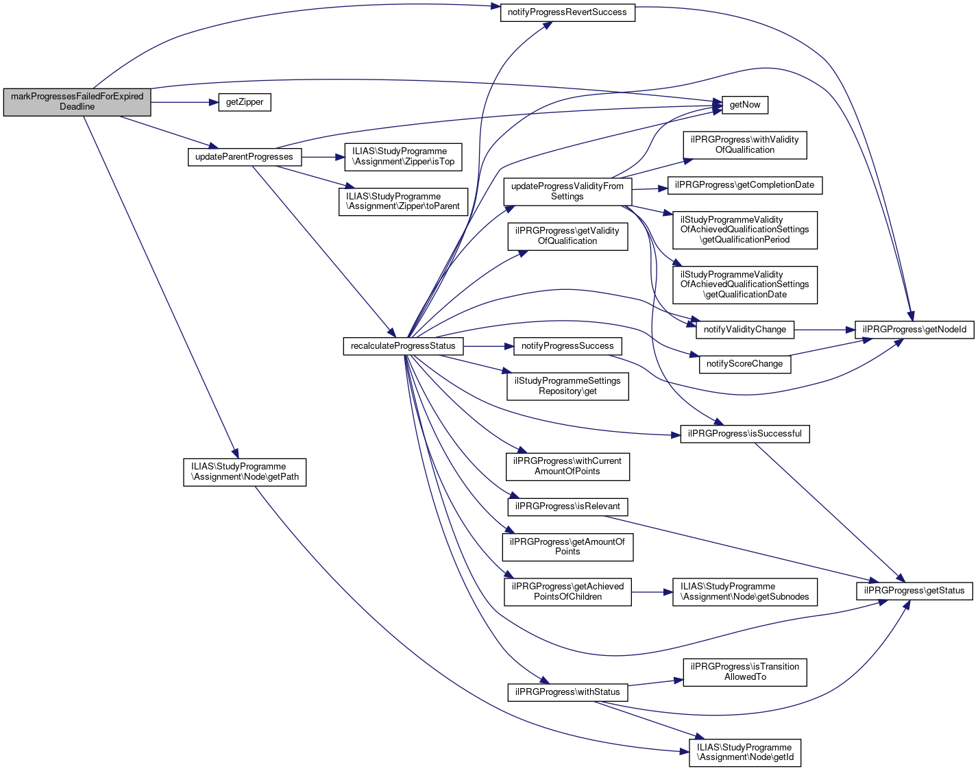 Here is the call graph for this function:| markProgressesFailedForExpiredDeadline | ( | ilStudyProgrammeSettingsRepository | $settings_repo, |