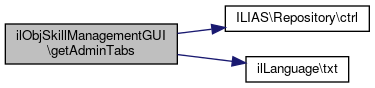 Here is the call graph for this function:| ilObjSkillManagementGUI::getAdminTabs | ( | ) |