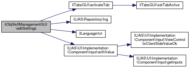 Here is the call graph for this function:| ilObjSkillManagementGUI::editSettings | ( | ) |