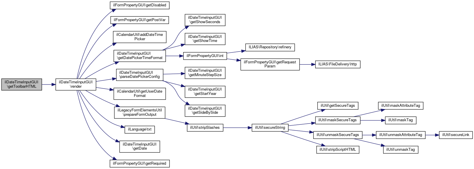 Here is the call graph for this function:| ilDateTimeInputGUI::getToolbarHTML | ( | ) |
