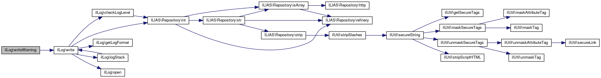 Here is the call graph for this function:| ilLog::writeWarning | ( | string | $a_message | ) |