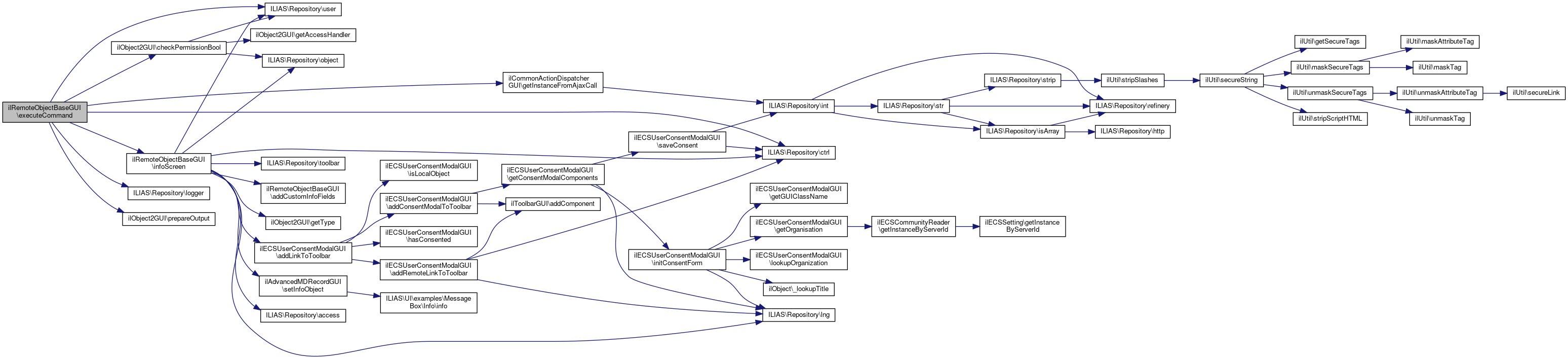 Here is the call graph for this function:| ilRemoteObjectBaseGUI::executeCommand | ( | ) |