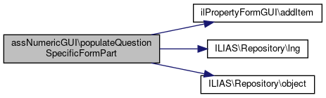 Here is the call graph for this function:| assNumericGUI::populateQuestionSpecificFormPart | ( | \ilPropertyFormGUI | $form | ) |