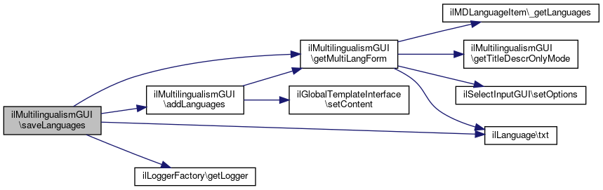 Here is the call graph for this function:| ilMultilingualismGUI::saveLanguages | ( | ) |