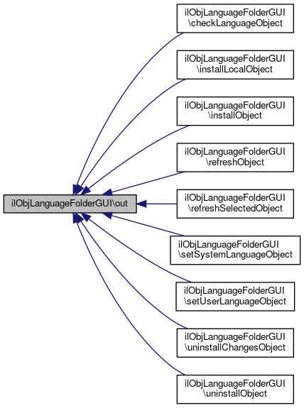 Here is the call graph for this function:| ilObjLanguageFolderGUI::out | ( | ) |