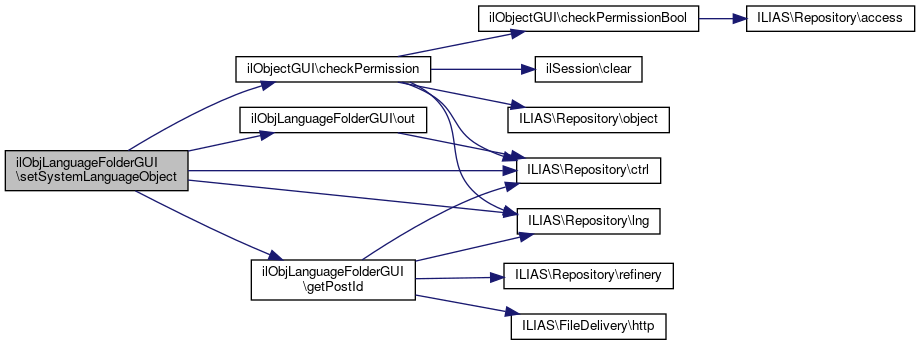 Here is the call graph for this function:| ilObjLanguageFolderGUI::setSystemLanguageObject | ( | ) |