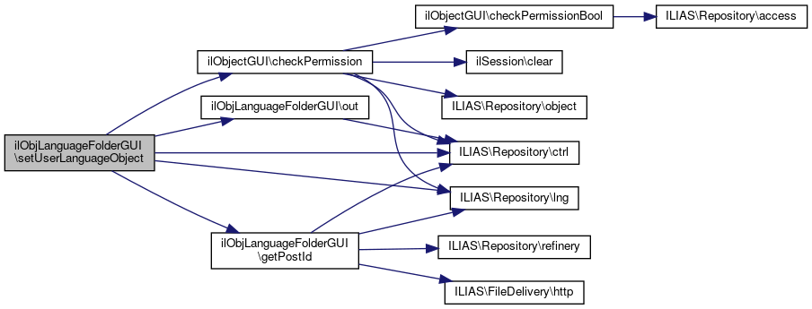 Here is the call graph for this function:| ilObjLanguageFolderGUI::setUserLanguageObject | ( | ) |