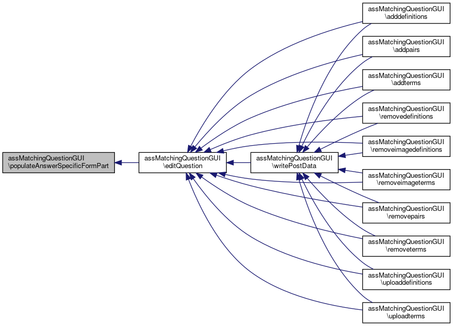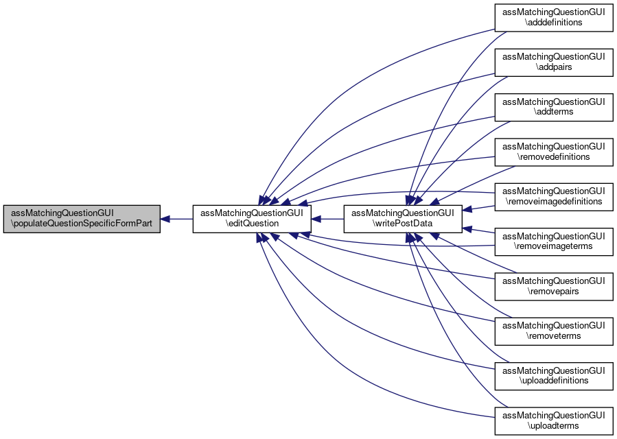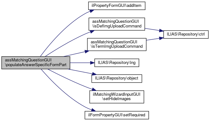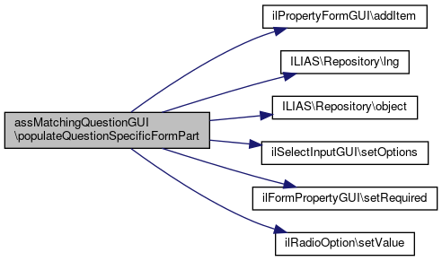 Here is the call graph for this function:| assMatchingQuestionGUI::populateQuestionSpecificFormPart | ( | \ilPropertyFormGUI | $form | ) |