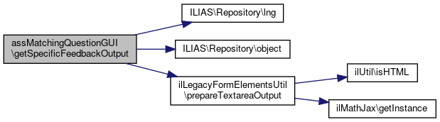 References ilAssQuestionFeedback\CSS_CLASS_FEEDBACK_CORRECT, ilAssQuestionFeedback\CSS_CLASS_FEEDBACK_WRONG, assQuestionGUI\generateCorrectnessIconsForCorrectness(), assQuestionGUI\getGenericFeedbackOutput(), assQuestionGUI\getILIASPage(), ilUtil\getImagePath(), getSpecificFeedbackOutput(), assQuestionGUI\hasCorrectSolution(), isCorrectMatching(), assQuestionGUI\isTestPresentationContext(), ILIAS\Repository\lng(), ILIAS\Repository\object(), ilLegacyFormElementsUtil\prepareFormOutput(), ilLegacyFormElementsUtil\prepareTextareaOutput(), and ilWACSignedPath\signFile().