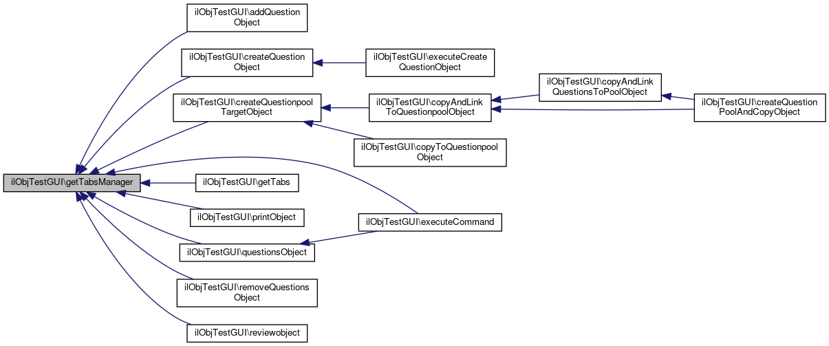 Here is the call graph for this function:| ilObjTestGUI::setTabsManager | ( | ilTestTabsManager | $tabs_manager | ) |