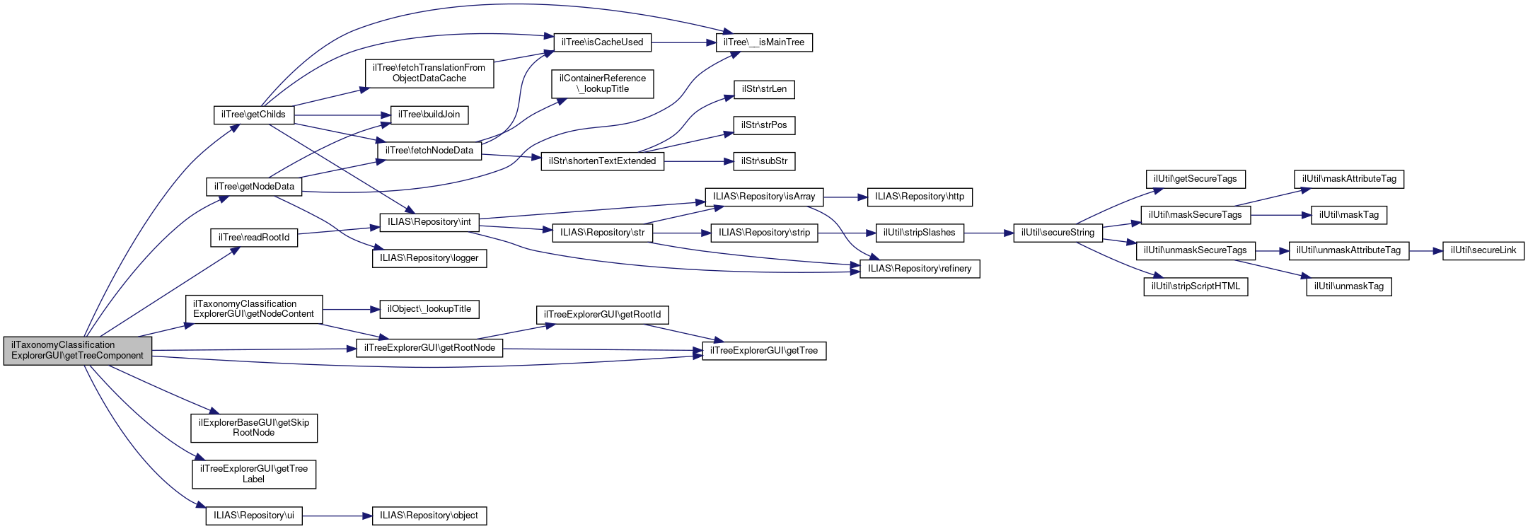 Here is the caller graph for this function:| ilTaxonomyClassificationExplorerGUI::getTreeComponent | ( | ) |