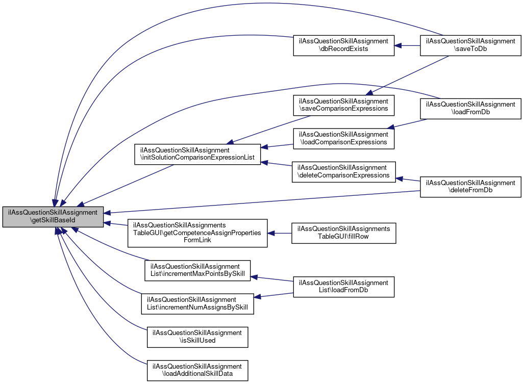 Here is the caller graph for this function:| ilAssQuestionSkillAssignment::getSkillBaseId | ( | ) |