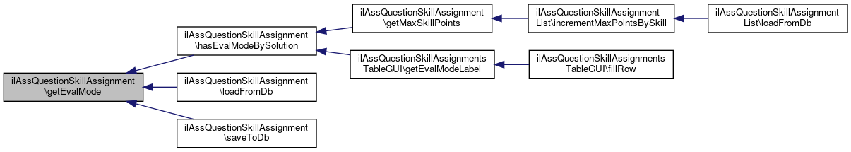 Here is the call graph for this function:| ilAssQuestionSkillAssignment::getEvalMode | ( | ) |