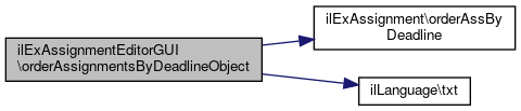 Here is the call graph for this function:| ilExAssignmentEditorGUI::orderAssignmentsByDeadlineObject | ( | ) |