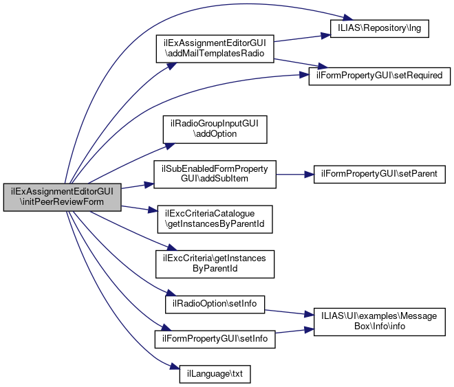 References $ctrl, $lng, $url, addMailTemplatesRadio(), ilRadioGroupInputGUI\addOption(), ilSubEnabledFormPropertyGUI\addSubItem(), ilExAssignmentReminder\FEEDBACK_REMINDER, ilExcCriteriaCatalogue\getInstancesByParentId(), ilExcCriteria\getInstancesByParentId(), ILIAS\Repository\lng(), ilExAssignment\PEER_REVIEW_VALID_ALL, ilExAssignment\PEER_REVIEW_VALID_NONE, ilExAssignment\PEER_REVIEW_VALID_ONE, ilRadioOption\setInfo(), ilFormPropertyGUI\setInfo(), ilFormPropertyGUI\setRequired(), and ilLanguage\txt().