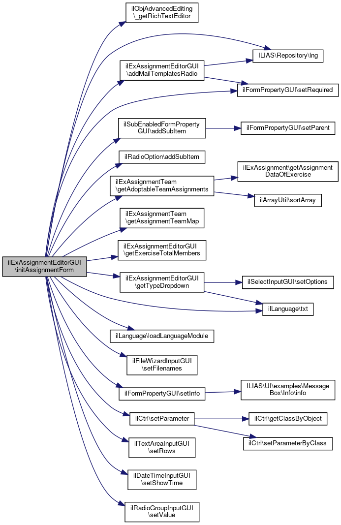 References $ctrl, $id, $lng, ilObjAdvancedEditing\_getRichTextEditor(), addMailTemplatesRadio(), ilSubEnabledFormPropertyGUI\addSubItem(), ilRadioOption\addSubItem(), ilExAssignment\FEEDBACK_DATE_CUSTOM, ilExAssignment\FEEDBACK_DATE_DEADLINE, ilExAssignment\FEEDBACK_DATE_SUBMISSION, ilExAssignmentTeam\getAdoptableTeamAssignments(), ilExAssignmentTeam\getAssignmentTeamMap(), getExerciseTotalMembers(), getTypeDropdown(), ilExAssignmentReminder\GRADE_REMINDER, ILIAS\Repository\lng(), ilLanguage\loadLanguageModule(), ilFileWizardInputGUI\setFilenames(), ilFormPropertyGUI\setInfo(), ilCtrl\setParameter(), ilFormPropertyGUI\setRequired(), ilTextAreaInputGUI\setRows(), ilDateTimeInputGUI\setShowTime(), ilRadioGroupInputGUI\setValue(), ilExAssignmentReminder\SUBMIT_REMINDER, ilExAssignment\TEAMS_FORMED_BY_ASSIGNMENT, ilExAssignment\TEAMS_FORMED_BY_PARTICIPANTS, ilExAssignment\TEAMS_FORMED_BY_RANDOM, ilExAssignment\TEAMS_FORMED_BY_TUTOR, and ilLanguage\txt().