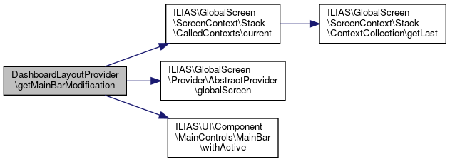 Here is the call graph for this function:| DashboardLayoutProvider::getMainBarModification | ( | CalledContexts | $screen_context_stack | ) |