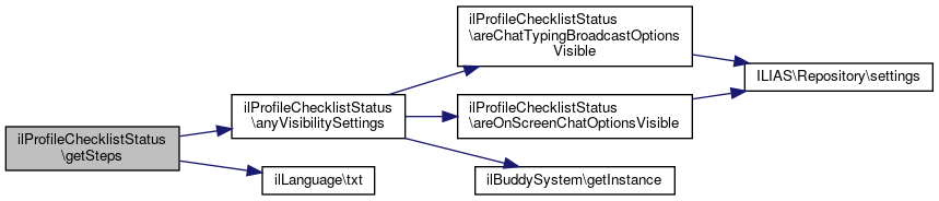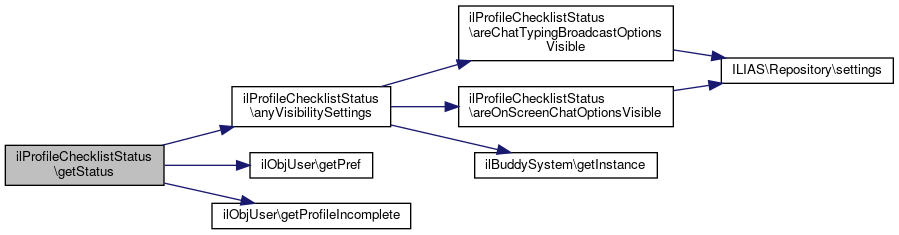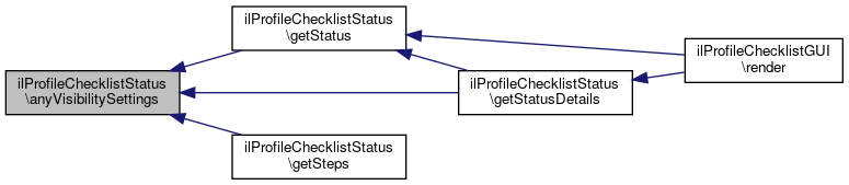 Here is the call graph for this function:| ilProfileChecklistStatus::anyVisibilitySettings | ( | ) |