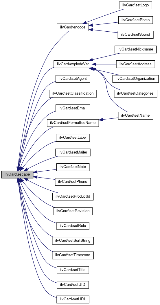 Here is the caller graph for this function:| ilvCard::escape | ( | string | $string | ) |