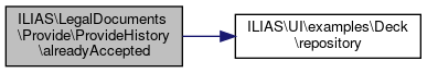 Here is the call graph for this function:| ILIAS\LegalDocuments\Provide\ProvideHistory::alreadyAccepted | ( | ilObjUser | $user, |