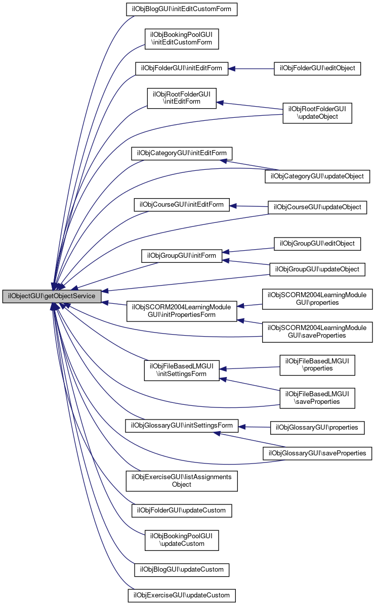 Referenced by getObjectService(), ilObjPortfolioTemplateGUI\initEditCustomForm(), ilObjMediaPoolGUI\initEditCustomForm(), ilObjSurveyQuestionPoolGUI\initEditForm(), ilObjLinkResourceGUI\initFormSettings(), ilObjSCORMLearningModuleGUI\initPropertiesForm(), ilObjContentObjectGUI\initPropertiesForm(), ilObjWikiGUI\initSettingsForm(), ilObjMediaCastGUI\initSettingsForm(), ilObjSCORMLearningModuleGUI\saveProperties(), ilObjContentObjectGUI\saveProperties(), ilObjSurveyQuestionPoolGUI\savePropertiesObject(), ilObjLinkResourceGUI\saveSettings(), ilObjWikiGUI\saveSettingsObject(), ilObjMediaCastGUI\saveSettingsObject(), ilObjPortfolioTemplateGUI\updateCustom(), and ilObjMediaPoolGUI\updateCustom().