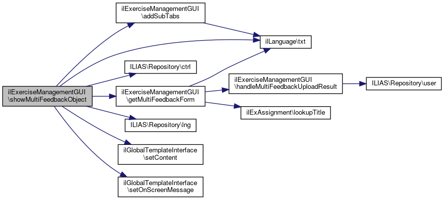 References $lng, $tpl, addSubTabs(), ILIAS\Repository\ctrl(), getMultiFeedbackForm(), ILIAS\Repository\lng(), ilGlobalTemplateInterface\setContent(), ilGlobalTemplateInterface\setOnScreenMessage(), and ilLanguage\txt().
