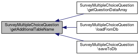 Here is the call graph for this function:| SurveyMultipleChoiceQuestion::getAdditionalTableName | ( | ) |