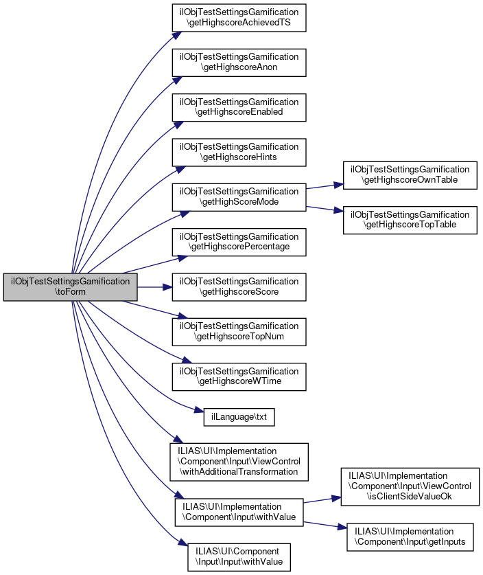Here is the caller graph for this function:| ilObjTestSettingsGamification::toForm | ( | \ilLanguage | $lng, |
