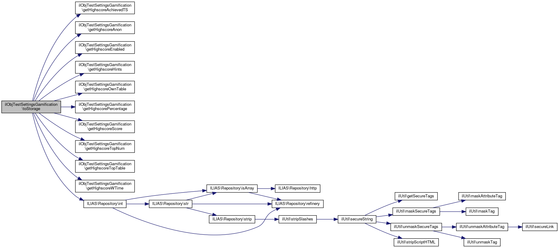 Here is the call graph for this function:| ilObjTestSettingsGamification::toStorage | ( | ) |