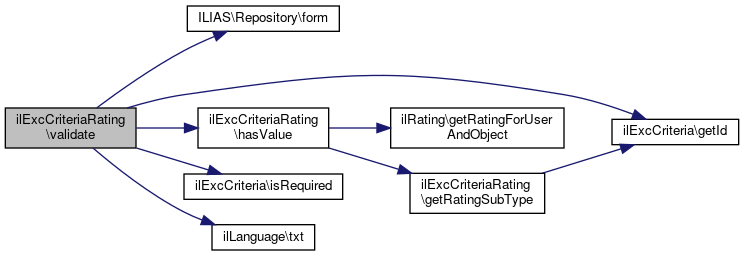 Here is the call graph for this function:| ilExcCriteriaRating::validate | ( | $a_value | ) |