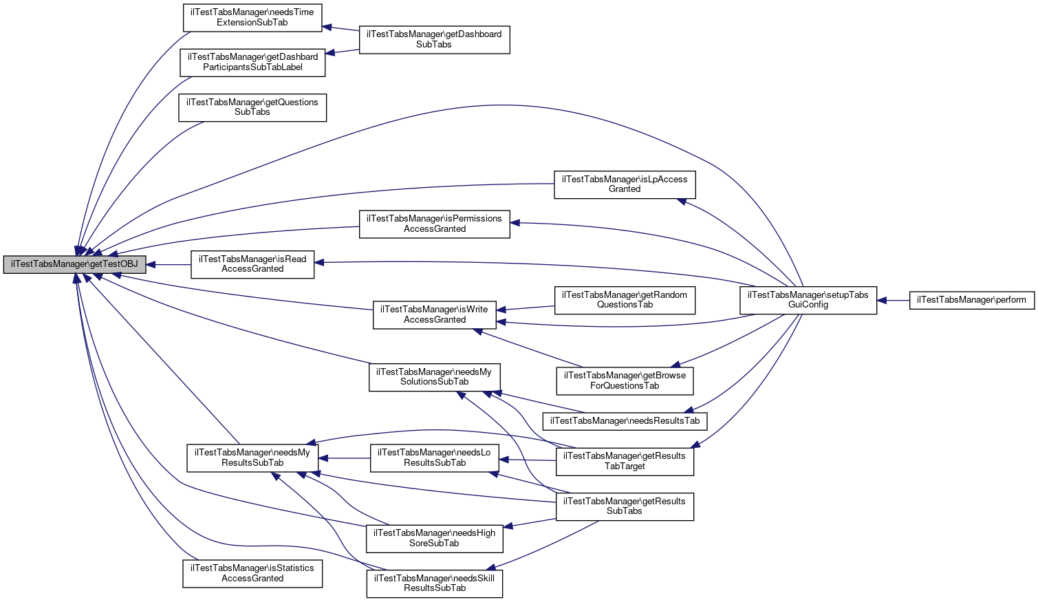 References ilObjAssessmentFolder\_getManualScoring(), checkScoreParticipantsTabAccess(), checkStatisticsTabAccess(), ilAssQuestionSkillAssignmentsGUI\CMD_SHOW_SKILL_QUEST_ASSIGNS, ILIAS\Repository\ctrl(), ilTestScreenGUI\DEFAULT_CMD, getBrowseForQuestionsTab(), getDashboardTabTarget(), getParentBackHref(), getParentBackLabel(), getResultsTabTarget(), getSettingsSubTabs(), getStatisticsSubTabs(), getTestOBJ(), getTestQuestionSetConfig(), hasParentBackLink(), isLpAccessGranted(), isPermissionsAccessGranted(), isReadAccessGranted(), isWriteAccessGranted(), ILIAS\Repository\lng(), needsDashboardTab(), needsResultsTab(), ILIAS\Repository\refinery(), and ILIAS\Repository\tabs().