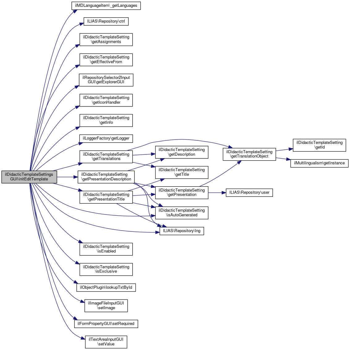 References ilMDLanguageItem\_getLanguages(), ILIAS\Repository\ctrl(), ilDidacticTemplateSetting\getAssignments(), ilDidacticTemplateSetting\getEffectiveFrom(), ilRepositorySelector2InputGUI\getExplorerGUI(), ilDidacticTemplateSetting\getIconHandler(), ilDidacticTemplateSetting\getInfo(), ilLoggerFactory\getLogger(), ilDidacticTemplateSetting\getPresentationDescription(), ilDidacticTemplateSetting\getPresentationTitle(), ilDidacticTemplateSetting\getTranslations(), ilDidacticTemplateSetting\isAutoGenerated(), ilDidacticTemplateSetting\isEnabled(), ilDidacticTemplateSetting\isExclusive(), ILIAS\Repository\lng(), ilObjectPlugin\lookupTxtById(), ilImageFileInputGUI\setImage(), ilFormPropertyGUI\setRequired(), and ilTextAreaInputGUI\setValue().