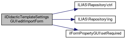 Here is the call graph for this function:| ilDidacticTemplateSettingsGUI::editImport | ( | ilDidacticTemplateSetting | $a_settings | ) |