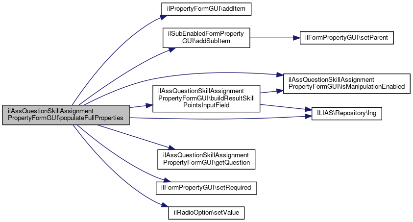 References ilPropertyFormGUI\addCommandButton(), ilPropertyFormGUI\addItem(), ilAssQuestionSkillAssignmentsGUI\CMD_SAVE_SKILL_QUEST_ASSIGN_PROPERTIES_FORM, ilAssQuestionSkillAssignmentsGUI\CMD_SHOW_SKILL_QUEST_ASSIGNS, ILIAS\Repository\ctrl(), isManipulationEnabled(), ILIAS\Repository\lng(), populateFullProperties(), populateLimitedProperties(), questionSupportsSolutionCompare(), ilFormGUI\setFormAction(), and ilPropertyFormGUI\setTitle().